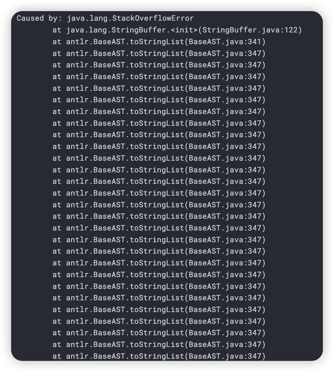 当时来到公司,一查日志都是长长的堆栈,伴随着java.lang.StackOverflowError。因为日志被截断了,一下子无法定位到具体位置,了解到异常的触发点是一个查询接口,IN 查询了大概 1800 个 key。让项目组尝试使用少量的 key 进行调用,发现能正常调用(当时松了一口气),最后测试下来在 1600 key 左右出现异常。项目组走紧急版本,改成 500 一次的分批查询,发版后线上异常恢复。